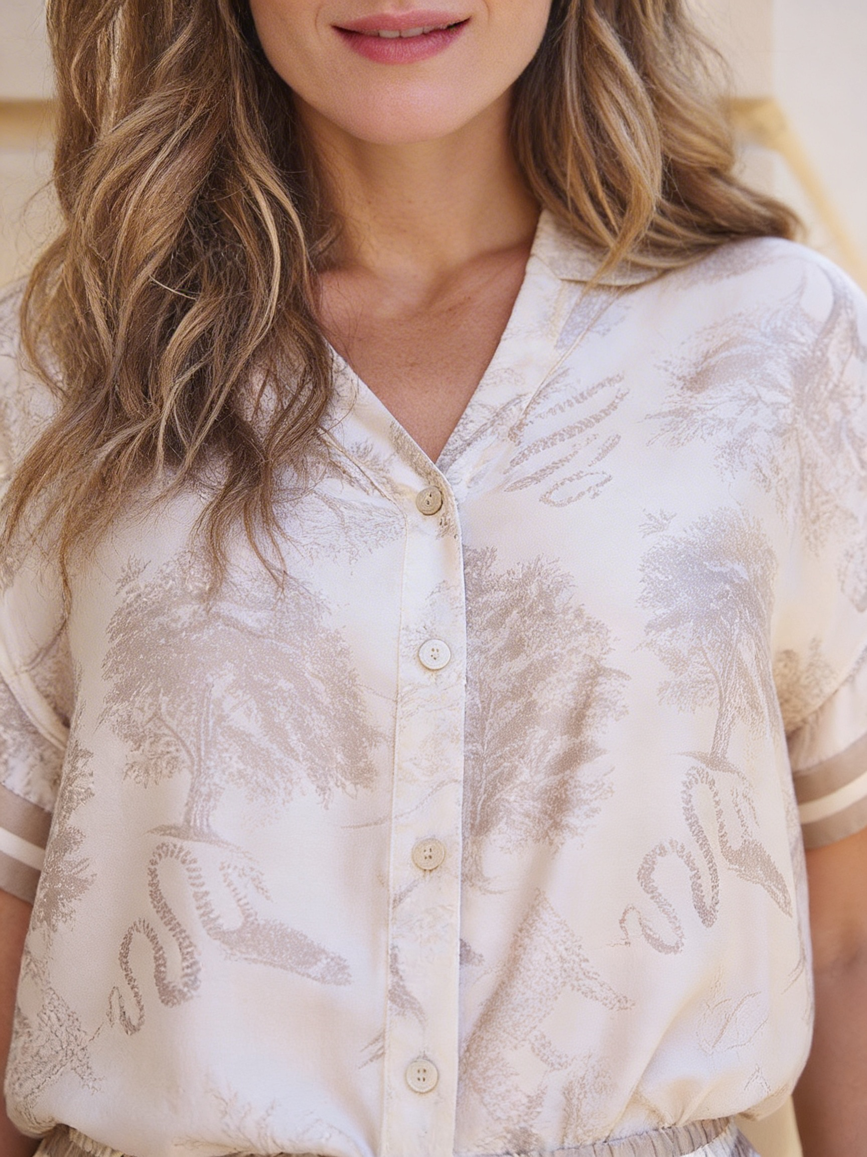 ESQUALO EDEN Safari Satin Blouse – Silky Soft Neutral Luxury Print Top